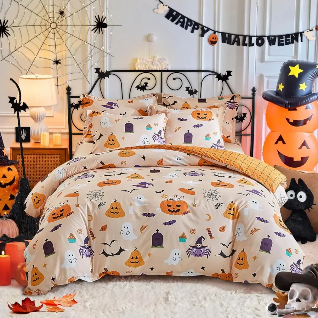This playful bedroom leans into the brighter side of spooky season, with bold Halloween wall art that instantly livens up the space. From the pumpkin plush to the gingham bedding and ghostly rug, every detail feels charmingly curated, perfect for younger kids who love Halloween with a side of whimsy.