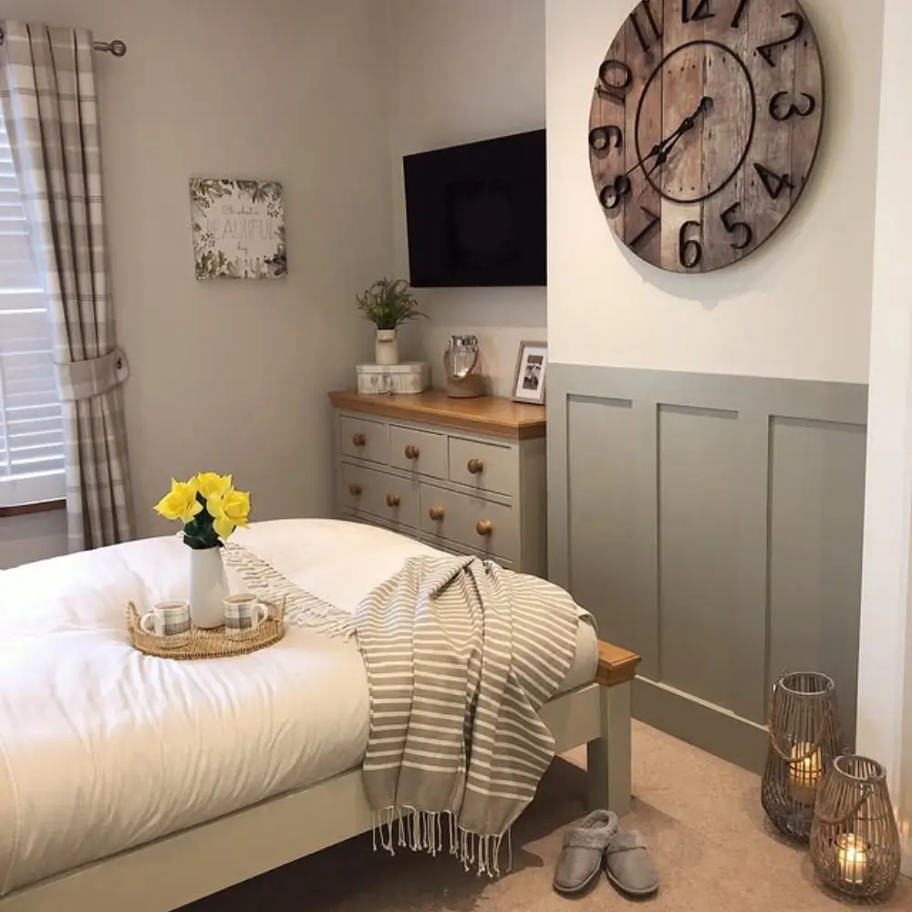 Think cozy throw blankets, blackout curtains that actually block the light, an accent wall that gives the room a focal point, and bedding so good your guests won’t want to check out.