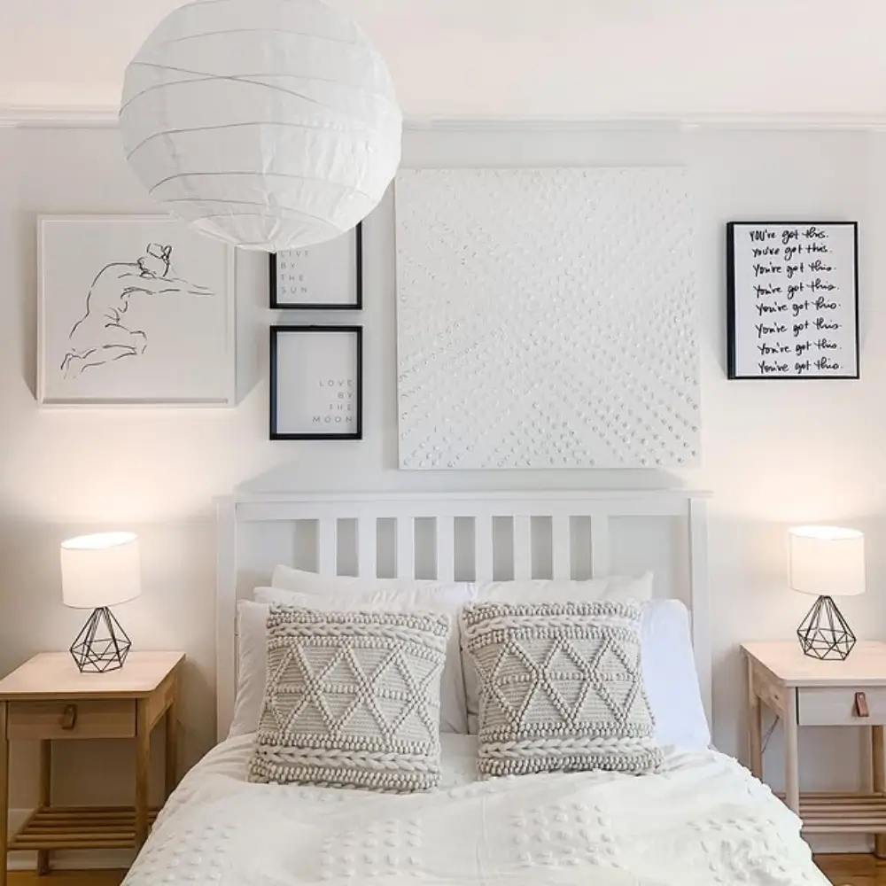 A deep, moody paint color, some textured wallpaper, or even a simple arrangement of framed prints behind the bed can give the room a clear focal point, and make your listing photos seriously scroll-stopping.