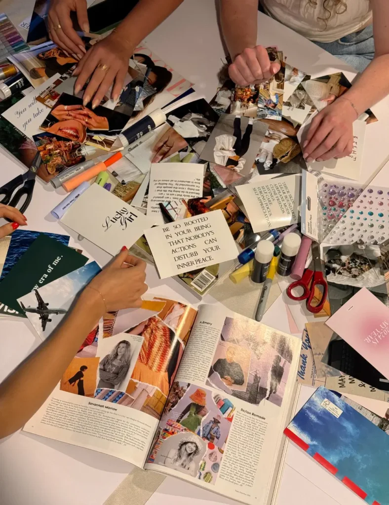 Think curated snacks, magazines spread across every surface, glue sticks being passed around like party favors, and conversations that go deeper than your average girls’ night.
