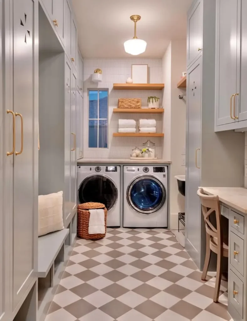 If your mudroom lives inside your laundry room, lean into it. Shared storage for detergent, cleaning supplies, and outerwear keeps everything streamlined. A cohesive setup saves time and makes daily routines feel more efficient.